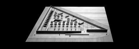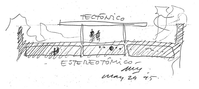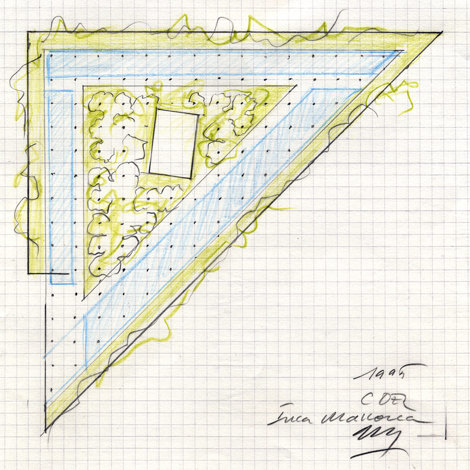Para ello creamos un jardín. Se levanta un alto muro de piedra de Marés siguiendo las trazas triangulares del solar creando un recinto cerrado. Se excava el solar completo en sótano y se restablece sobre él el plano horizontal con un forjado que se cubre de travertino al igual que la cara interior de los muros. Se crea un podio cercado con un muro. Se tiene así una caja de travertino abierta al cielo. Sobre ella se traza una trama ortogonal de 6 x 6 m. Y separándose de los muros, se crea una banda paralela a los lados del triángulo, con unos pilares blancos cilíndricos metálicos sobre los que se coloca un techo plano que vuela dos metros por cada lado de la línea de pilares. Se acristala, sin carpinterías, creando un espacio continuo a través del plano horizontal del suelo de travertino.