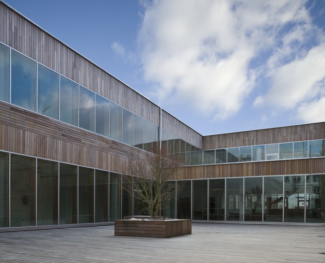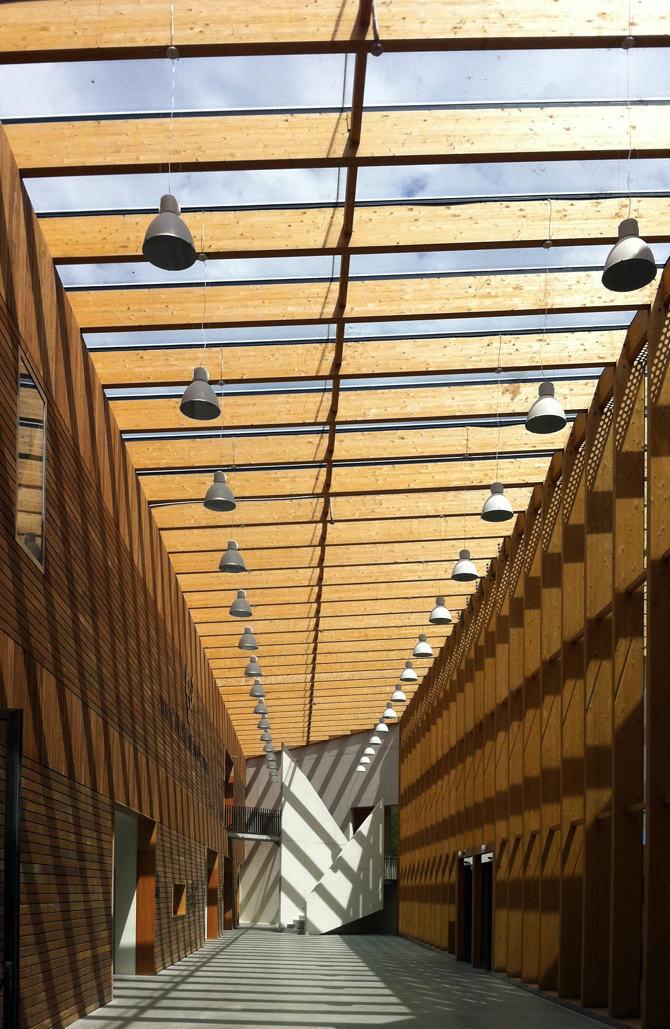 En la calle que divide el edificio las fachadas se realizan con vidrio y un cerramiento de madera donde todos los elementos que lo componen, incluida su estructura, son de madera. También el pavimento es de madera, relacionando las dos fachadas y aportando un carácter monolítico a este espacio de descanso. La envolvente curva evita una exposición directa de las fachadas, con lo que se reducen las pérdidas térmicas a través de estas.