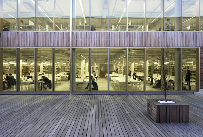 El segundo bloque contiene la biblioteca con sus salas de lectura, recursos informáticos y mediateca. La planta sótano se destina a aparcamiento y contiene también el depósito compacto.