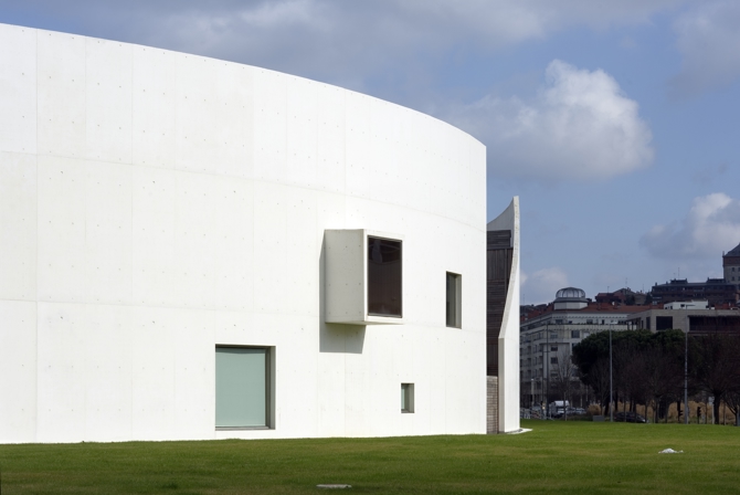 La fachada principal del edificio es una envolvente autoportante de hormigón autocompactable blanco de 25cm de espesor. Estructuralmente este cierre es independiente del resto del edificio para evitar verse afectado por sus dilataciones estructurales, de este modo se ha podido realizar todo el muro perimetral sin juntas de dilatación.