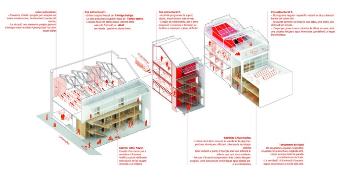 Tres puntos de partida: entender el valor histórico de Lleialtat Santsenca (1928), una antigua cooperativa obrera del barrio de Sants; conocer al detalle el estado físico del edificio para mantenerlo en la medida de lo posible; y ser sensibles a todo el proceso de colaboración puesto en marcha en 2009 por las organizaciones vecinales para recuperar el edificio.