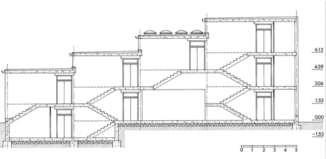 Las aulas se despliegan escalonadamente media planta, de manera que cada crujía recibe iluminación y soleamiento por encima de la cubierta de la anterior. De este modo se originan galerías muy cortas, pues se disponen en el sentido de la menor longitud del aula y no en el de la mayor como es habitual. La galería de distribución va ascendiendo media planta en cada crujía, desde planta y media (mas media enterrada) al sureste, hasta un total de tres en la fachada noroeste.