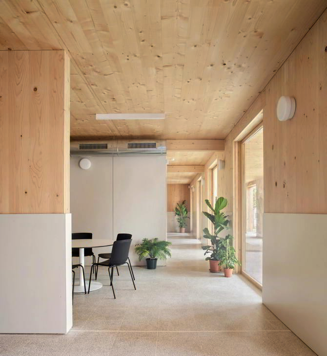 Gracias a una serie de estrategias pasivas, entre ellas un muy buen aislamiento, en parte debido a la madera, y los toldos proyectables que se regulan automáticamente en función de la temperatura e incidencia solar, conseguimos un edificio de consumo casi nulo con certificación Breeam.
