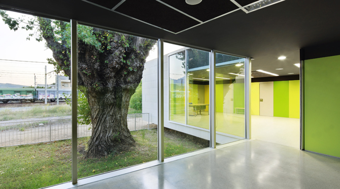 El volumen en relación con la calle presenta dos plantas, un encuentro directo con la acera y aberturas verticales. En cambio, los volúmenes que se enfrentan con el contexto ferroviario son de una planta, quedan elevados respecto el terreno y las aberturas se unifican en una única franja horizontal. La hilera de chopos y el depósito de las antiguas instalaciones ferroviarios nos acotan el ámbito exterior del acceso.