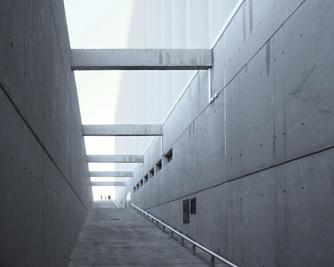 Los cerramientos dispuestos en el interior de los pórticos terminan de definir una volumetría regular y poderosa, con luces y sombras siempre cambiantes fruto de una estructura que protege el interior del sol y es también imagen sólida y definitiva del Centro de Biotecnología.