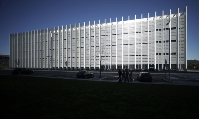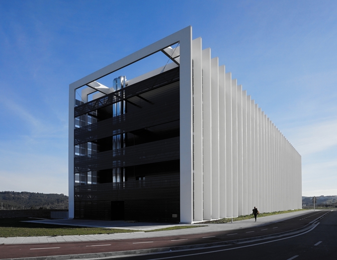 La envolvente desarrollada no informa sobre la escala del edificio, generando un objeto abstracto. Los pórticos estructurales constituyen el marco delimitador de las fachadas transversales en las que se ha procurado buscar una transparencia que muestre profundidad para enfatizar los pórticos. En las fachadas más largas la lectura del interior queda oculta al observador. En las fachadas longitudinales la seriación regular de los pórticos sobresale respecto al plano del cerramiento y se eleva por encima del antepecho de cubierta, uniéndose en la coronación del edificio con sus simétricos. En los paños definidos entre estos elementos verticales, una piel de chapa metálica exenta del cerramiento y con diferentes intensidades de perforación en función de la orientación de las fachadas colabora en la protección solar del interior. Tras esta, un panel industrializado de núcleo aislante constituye el cerramiento opaco y aislante del edificio. En él se intercalan huecos vidriados que aportan luz natural a todos los espacios de trabajo.