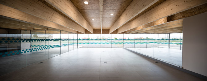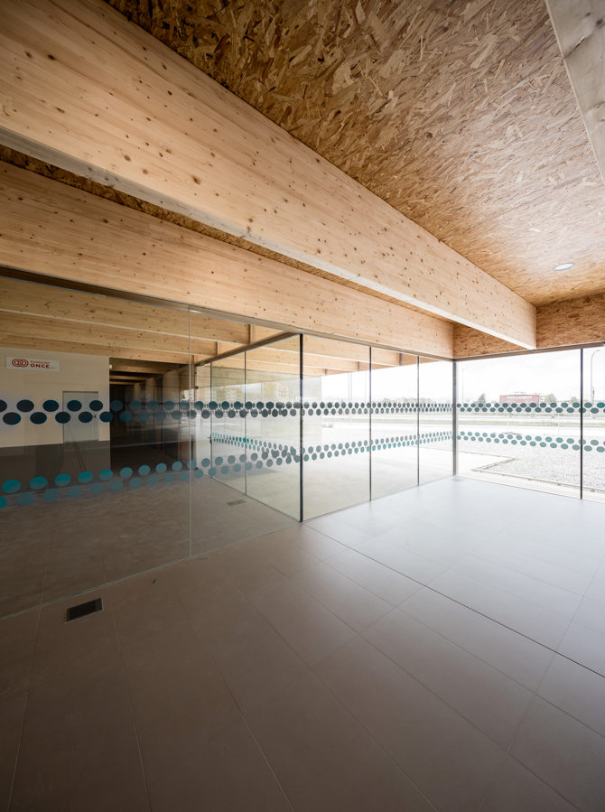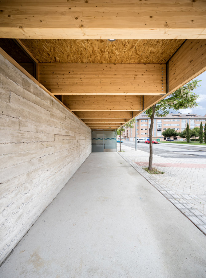 Todo el edificio se resuelve con una cubierta abarcante de vigas de madera laminada que flota sobre el terreno a 2,70 m de altura. Las vigas están separadas 1,50 m a ejes y tienen 72 cm de canto, lo que aporta al techo una fuerte presencia y un gran relieve plástico. De esta forma se espera que las vistas y la atmósfera interior queden atrapadas bajo una “tapa” singular pero amable. Se concentran las energías del proyecto en este techo escultórico porque los usuarios realizan buena parte de las actividades de rehabilitación, tumbados en camillas mirando hacia arriba, o tienen una visión baja propia de las sillas de ruedas.