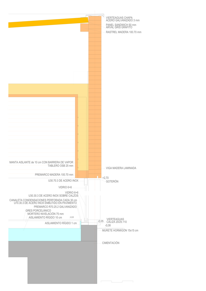 La cubierta se apoya en muros perimetrales de hormigón blanco encofrado con tablillas, que configuran una fachada más cerrada a la calle y otra discontinua al jardín. Los ventanales y las divisiones interiores más significativas se resuelven con vidrio de suelo a techo para preservar la diafanidad del espacio. Solo hay tabiques en despachos y aseos, que llegan hasta la parte inferior de las vigas, igual que las puertas y ventanas. En todas las zonas el pavimento es de gres porcelánico antideslizante de gran formato, también en los zócalos. El suelo es radiante-refrescante, y todos los demás conductos discurren por la cámara de cubierta, para dejar visto el techo de madera sobre las vigas.