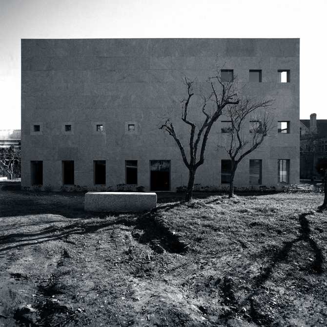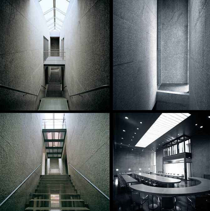 Se trata de una edificación eminentemente racional en su concepción constructiva, que emplea la piedra, el acero y el vidrio como materiales básicos. Una construcción de formas puras, escuetas, una caja de piedra de planta cuadrada formada en su interior por dos cajas prismáticas de igual volumen, separadas entre sí por una grieta de luz por la que asciende una larga y etérea escalera que comunica todas las plantas.