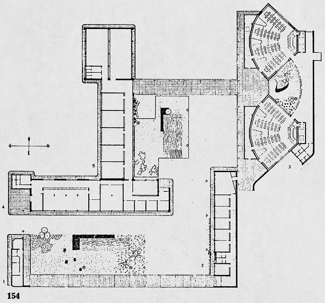 La disposición abierta de los diferentes elementos de escasa altura, articulados mediante los espacios libres y conectados por las galerías, fue justificada por Fisac debido a las características del emplazamiento, topografía plana y programa propuesto. La utilización de las premisas espaciales del Movimiento Moderno en la organización de los patios abiertos se superpone a recursos compositivos de la arquitectura hispanomusulmana, como la ordenación perpendicular de las piezas y de los patios ajardinados, que Fisac relacionaba con la composición de La Alhambra.