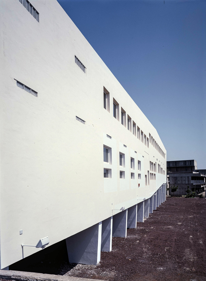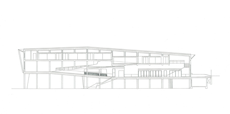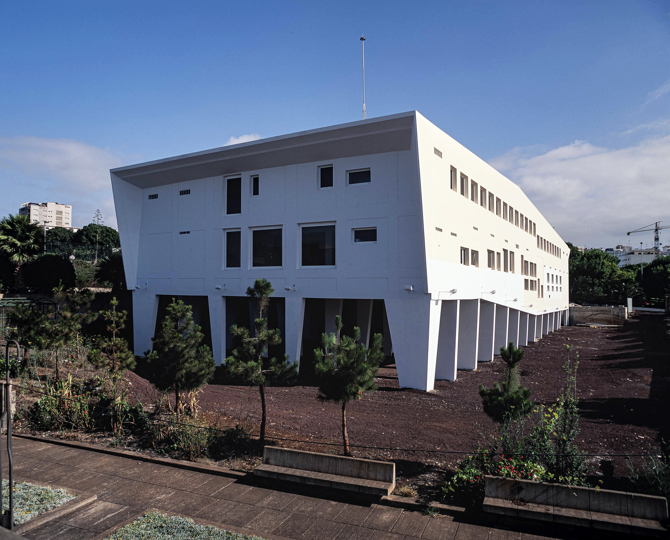 El edificio se sitúa separado del suelo por sendos pilares apantallados, de manera que se permite, por un lado, que el acceso se realice a nivel de la calle, y de otra, que el espacio ganado por debajo se pueda emplear para aparcamientos o para futuras ampliaciones. La sección es el instrumento proyectual generador del edificio. La supresión de barreras arquitectónicas, junto con un acceso cómodo a los diferentes niveles que dividen los recorridos, determinan la elección de la rampa como elemento organizador del conjunto arquitectónico.