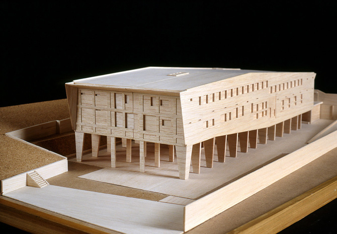 El edificio se genera de acuerdo con sus propias leyes geométricas y aparece en su entorno como un objeto hasta cierto punto anómalo y descontextualizado. En el interior, la sección longitudinal se manifiesta en el perfil de las fachadas laterales, que se quiebran según el ritmo impuesto por el sistema interior de las rampas. Pero las rampas son algo más que un recurso, representan un gesto y a la vez una metáfora. Un gesto porque su tratamiento y dimensiones van más allá de la mera función transportadora. Y son una metáfora porque, al igual que la cultura no admiten estabilidad, sino una continua tendencia al esforzado ascenso al conocimiento, muchas veces difícil de alcanzar.