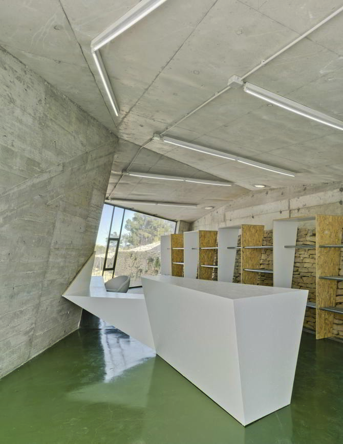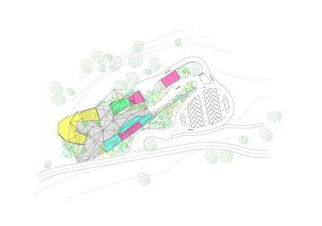 Así, los espacios funcionales se dispersan y el deambular se construye en una intemperie geológica que cubrimos ligeramente con un verde trepador que pronto debe desarrollarse y que a veces se traspasa para acceder a los servicios del centro, que también disfrutamos la oportunidad de equipar.