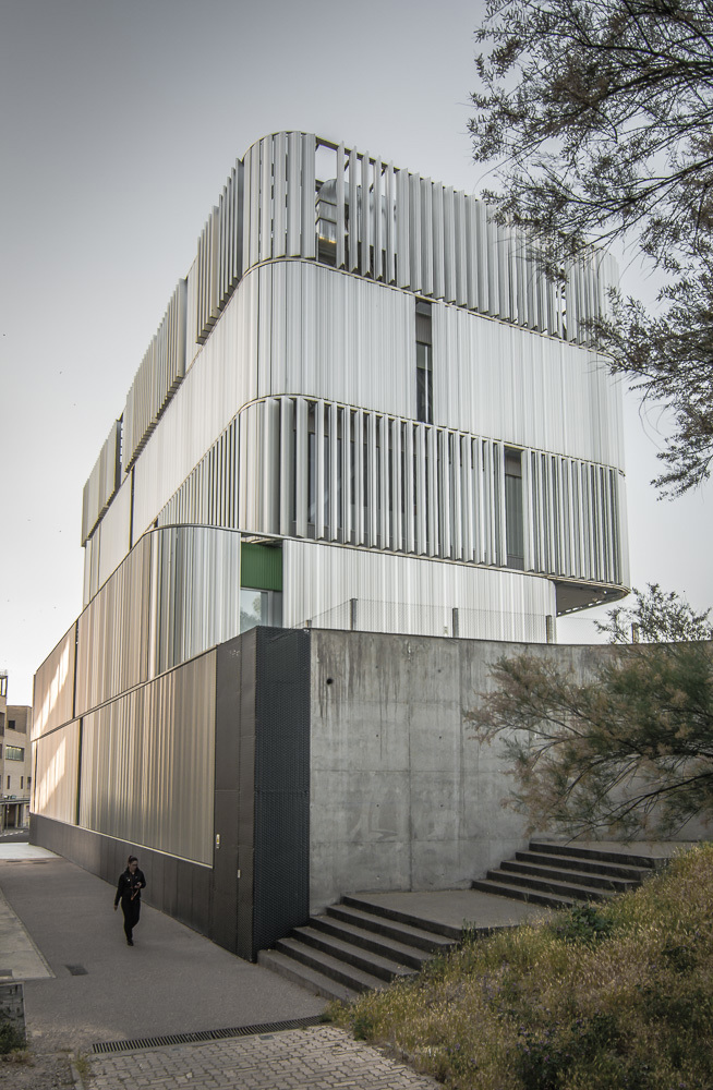 Un sistema pasivo de control de soleamiento e iluminación en las orientaciones predominantes que requieren amortiguar la incidencia solar y difuminar la iluminación directa. Una piel que cambia según las necesidades de las distintas áreas y departamentos, ya sea abriéndose para captar luz y energía o cerrándose como protección solar o de seguridad. Y será esta piel-filtro la que caracterice al nuevo Centro de Investigación Biomédica de Aragón.