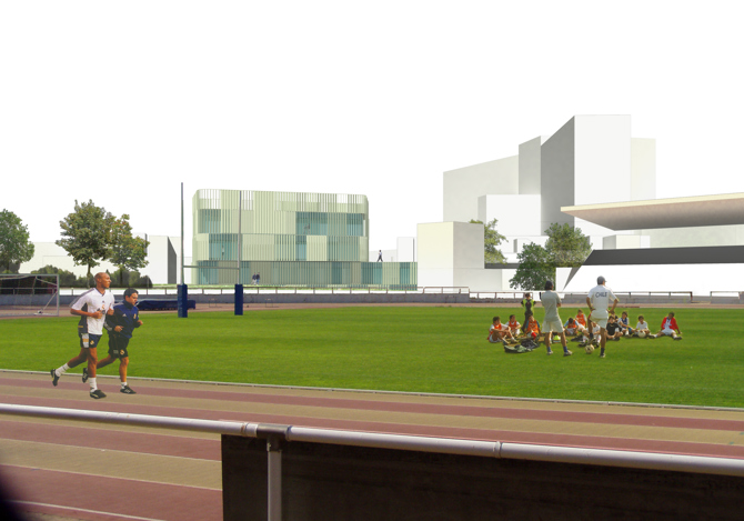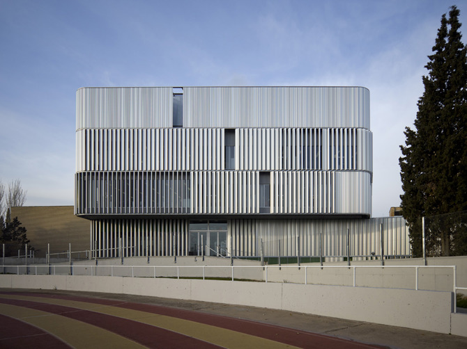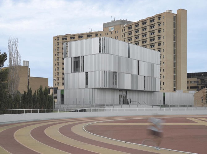 El desarrollo de la edificación siguiendo el eje norte-sur de la parcela nos lleva a adoptar un sistema-filtro en la totalidad de la fachada que cambia y vibra, que reconoce distintos niveles y se hace transparente o se densifica según los distintos puntos de vista tanto del propio usuario al interior como de los peatones al exterior, ya liberado hacia los vacíos de la pista de atletismo y el aparcamiento del hospital.