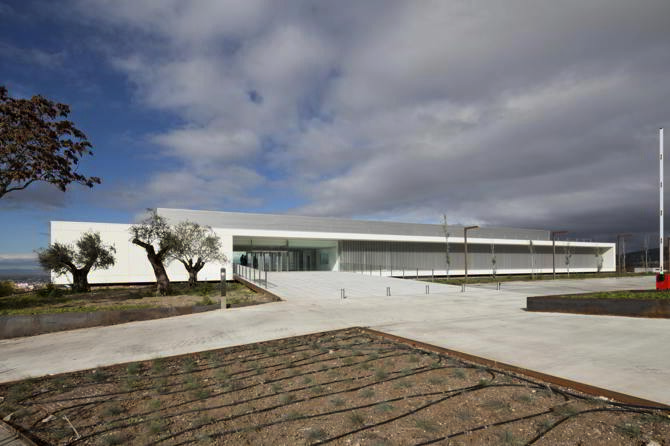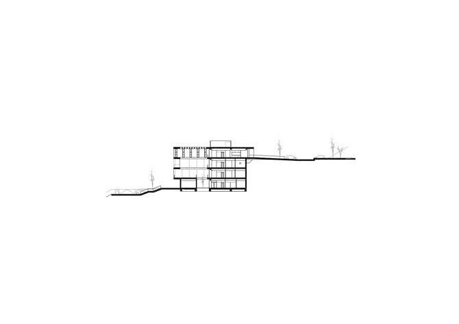 Básicamente, esta estructura está configurada por tres bandas paralelas a las líneas de nivel: una primera que en las plantas inferiores queda en contacto con el terreno excavado de la ladera, una central que acoge todas las circulaciones verticales y horizontales, así como los servicios y patios de instalaciones del edificio y, finalmente, una tercera, más profunda, con una estructuración a la vez transversal que posibilita la organización de las distintas áreas del programa.