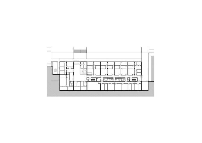La estructura general del edificio se hace singular en este nivel (único sobre rasante en sus cuatro fachadas) produciendo una secuencia de patios abiertos a la luz y el paisaje que pauta la organización de los espacios del programa en esta planta.