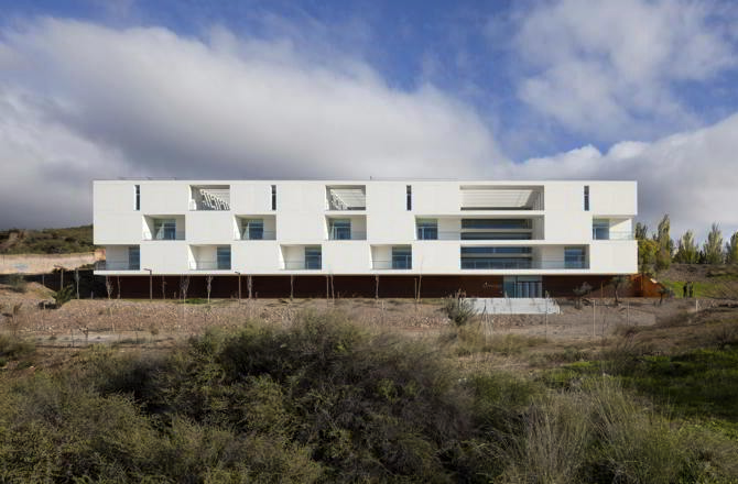 El proyecto considera fundamental la manera de asentarse en el paisaje de la ladera de Cartuja: lo hace reconstruyendo con su edificación la cornisa existente a la cota +770, de tal forma que en la plataforma de acceso superior, el edificio aparece con una única planta, descolgándose en estratos que dan continuidad a la propia topografía de la ladera. Se concibe así el edificio en continuidad con la estructura topográfica del talud, siendo sus estratos una metáfora construida de la propia estructura del paisaje.