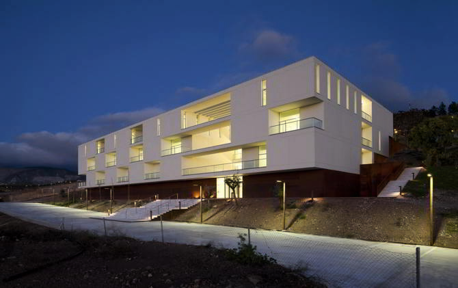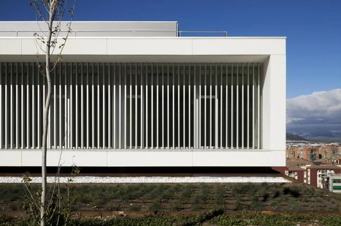 La posición encastrada en la pendiente ha posibilitado trabajar con dos escalas, una más próxima y amable en relación al Campus de Cartuja que se aprecia en cómo el edificio aparece bajo, horizontal y terso en la plataforma superior y otra escala, que tiene que ver con el paisaje lejano, en donde el edificio se muestra más abstracto con huecos netos y profundos.
