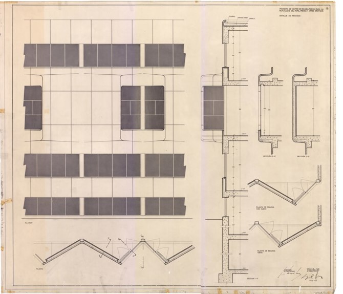 “El valor expresivo del edificio se encomienda muy principalmente a las características espaciales que han de reunir las ventanas de las diferentes plantas en una sencilla franja corrida de iluminación uniforme en semisótano, planta baja y planta segunda, y de una disposición pareada, con ritmo vertical, oblicuo, en la zona de habitaciones de la planta primera. Este rompimiento de ritmo, unido a las características plásticas del hormigón moldeado y a la textura propia de este material, son los que proporcionan una fisonomía propia en las que en cada fachada y en su conjunto se ha procurado un equilibrio de huecos y macizos de zonas salientes y de elementos volados en la marquesina de entrada y en los huecos que proporcionan ventilación a los pasillos de la planta primera y a los aseos generales de la misma” (Memoria del proyecto).