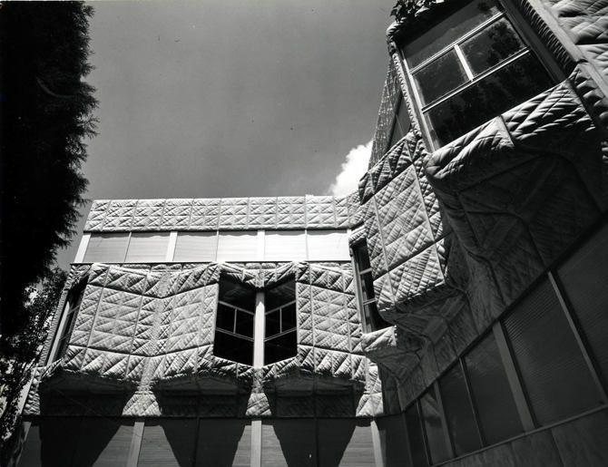 La fachada está revestida del hormigón flexible con divisiones mayores de los módulos construidos y una cuadrícula interior más pequeña dentro de la cual hay incisiones en ambas direcciones en posición oblicua. Junto a este efecto de los planos generales del conjunto las formas curvadas de los voladizos superiores e inferiores acentúan el carácter fluido de la masa de hormigón que define la fachada del conjunto edificado.