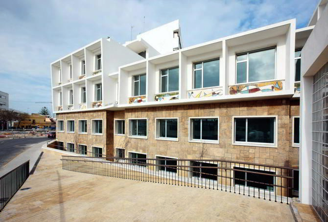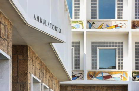 La piedra se ha utilizado en la planta baja como revestimiento. La estructura de hormigón que queda al exterior en muchas zonas del edificio, sirviendo en parte como protección del sol, se ha blanqueado en su totalidad. Se han dejado huecos amplios para dar buena iluminación a las consultas, y en algunas de ellas se ha colocado tabique de cristal recercando el hueco y haciendo así translúcido todo el paramento exterior de la consulta.