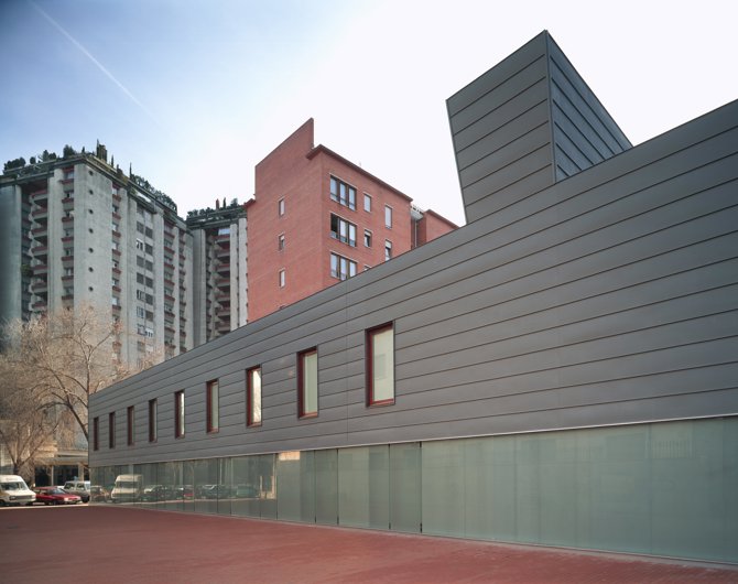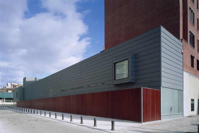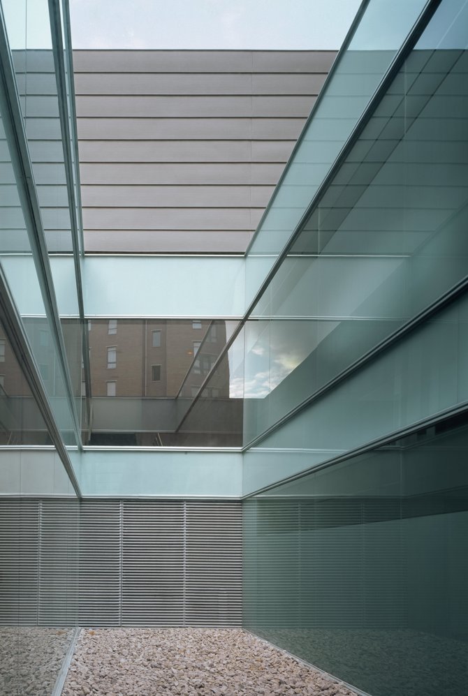 El volumen resultante se dispone en “L”, adyacente a dos calles de nueva creación que delimitan, junto con una construcción existente en el ángulo opuesto, un patio interior de manzana. Desde el principio el edificio trata de superar su condición de pieza arquitectónica y crear un orden urbano. Este objetivo se plantea, paradójicamente, desde la distancia, evitando el diálogo directo con el panorama descontextualizado más próximo, y se traduce en el hermetismo exterior del edificio, que también resulta oportuno desde la perspectiva funcional dado que el uso de centro médico requiere una cierta privacidad.