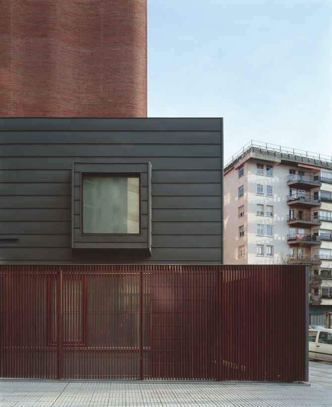 En el uso de los materiales se manifiesta la misma voluntad muda y rotunda que en la forma. El zinc de las partes superiores de las fachadas, colocado sobre una base aireada de madera, otorga un acabado terso y uniforme que dialoga con las extensas superficies acristaladas mediante un vidrio de doble capa que aloja en su interior una malla de acero inoxidable. El vidrio actúa reflejando la luz y produciendo efectos de interés cromático, y, además, su disposición a modo de cortinaje oculta los interiores hacia la calle mientras que permite la visión del exterior desde las consultas. En último término, la madera asume el papel de contrapunto frente a los reflejos metálicos y se emplea para destacar elementos singulares como la esquina del acceso, con tablones de iroco, y la reja de cierre del patio inglés, constituida por piezas exentas que quedan engarzadas por una varilla roscada de acero inoxidable.