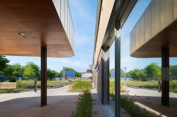 Además, dos de los patios funcionan como invernaderos cuya cubrición traslúcida y lamas orientables de protección solar, que resaltan sobre el plano inclinado de cubierta, permitirán atemperar el aire interior de acuerdo con la época estacional, lo que supondrá una ostensible mejora y rendimiento energético de las instalaciones de climatización situados en la cabecera de los patios bajo el espacio bajo-cubierta que facilita la pendiente de la cubierta.