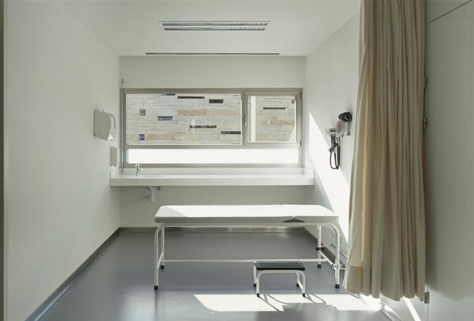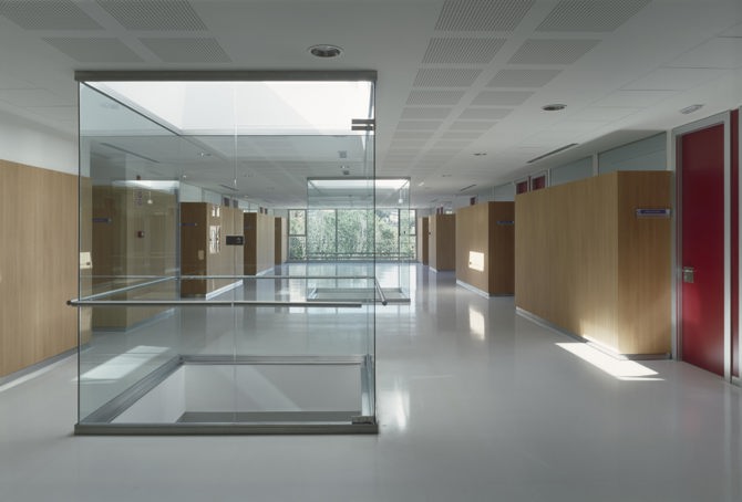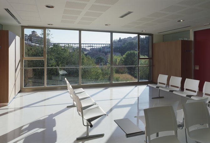 La superposición de vestíbulos de ambas plantas, y el enfrentamiento de ambos accesos, permiten una conexión tanto visual como física, ofreciendo al usuario desde el primer momento una visión de la estructura espacial del edificio, evitando desorientaciones. El edificio, resuelto mediante tres crujías, permite ubicar en la central tanto las circulaciones como las zonas de espera, potenciando las relaciones con el exterior en las orientaciones y vistas de mayor interés. Las dos crujías extremas soportan el programa rotacional, con vistas una al muro talud, preservado de las vistas por el muro perforado; y la otra con vistas al valle, preservado de las vistas mediante la incorporación de persiana de lama exterior.