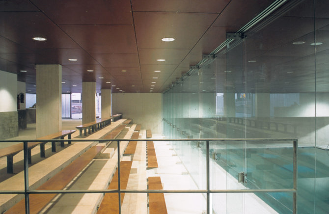 De la sección y del cerramiento exterior surge el concepto constructivo de piscina cubierta. Un plano horizontal superior compartido conecta el área de actividad visible y el área de espectadores públicos. Así, el techo suspendido de madera crea un efecto de continuidad y comprime el espacio de arriba, enfocando la atención del espectador hacia el agua, abajo. El recinto de la piscina está envuelto por gruesos muros de hormigón blanco, a excepción del vano lateral sur, por el que se filtra la intensa luz solar para iluminar la principal zona de actividad.