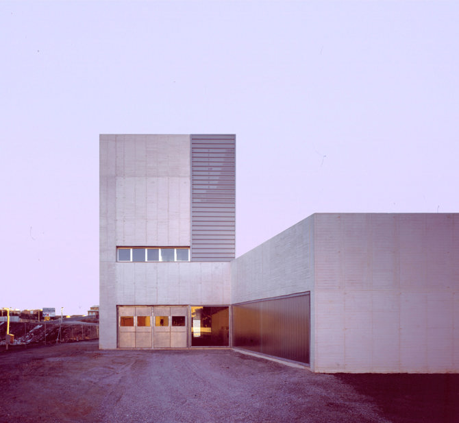 Desde el vestíbulo la escalera que desliza por el muro límite al norte nos conduce a la planta de administración (nivel +3,90) que incorpora los despachos, aseo, almacén y sala de reunión. Este bloque que se desarrolla en la crujía paralela a la gran nave destacará sobre el resto de las edificaciones cualificándose con el cambio de material de revestimiento, aligerándose con las planchas de metal perforado e introduciendo con su mayor altura una referencia en la distancia. Se recoge en esta planta (nivel +8,00) la maquinaria precisa de las instalaciones de climatización, ascensor y grupo electrógeno.