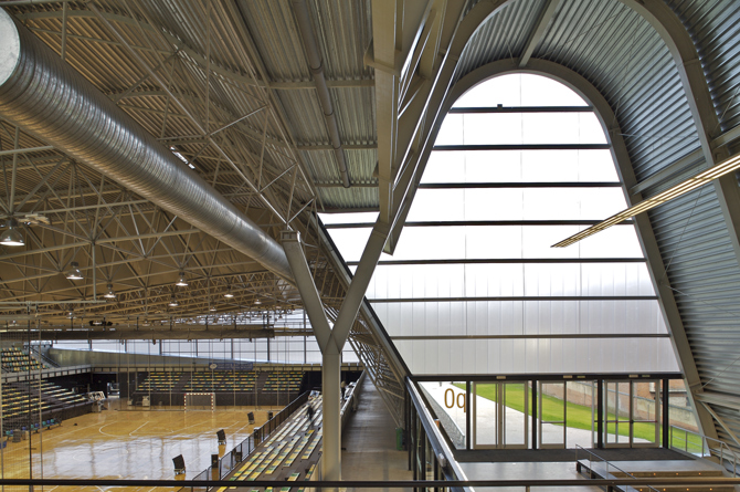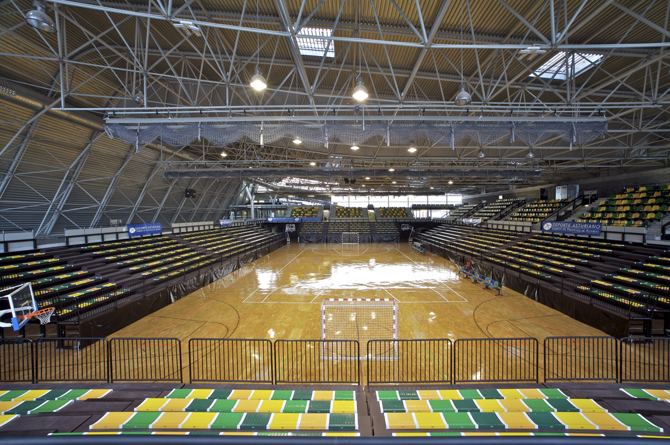 En el perímetro de la pista, y con objeto de mejorar sus prestaciones absorbentes en conciertos y actos similares, parte de los paramentos se revisten con chapa mini onda perforada, pintada de negro, con paneles de lana de roca en su trasdós.