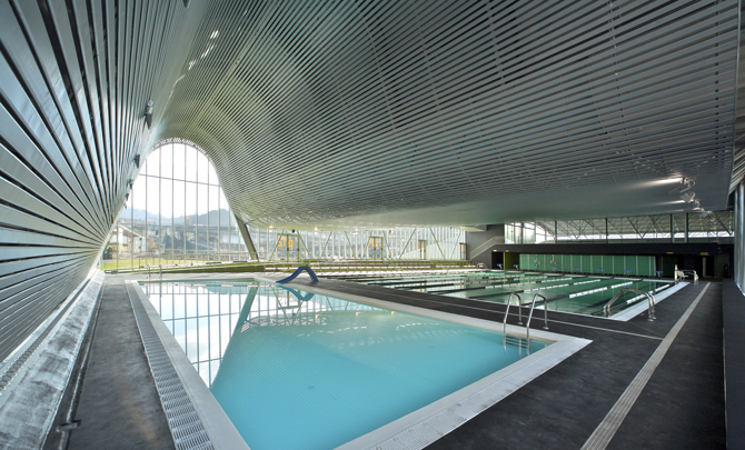 El simbólico plegado de la capa superficial del terreno nos descubre los estratos y grandes masas carboníferas del subsuelo, como la propia playa de la piscina, pintada de negro: estamos en el centro de las cuencas mineras de Asturias. Al igual que sucede en las minas, proyectamos edificios dentro del edificio: como el volumen que alberga las oficinas; pliegues y fracturas; como los planos inclinados bajo las gradas que conforman el techo de los vestuarios, puentes para salvar espacios y fallas; como la pasarela que desde el control de acceso da paso a las piscinas.