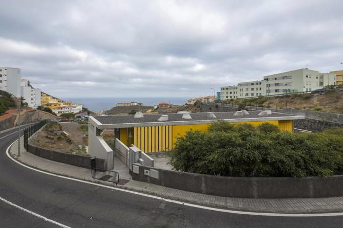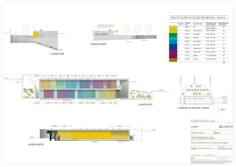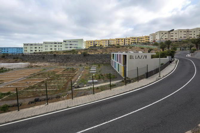 El Centro Dotacional para el Barrio de El Lasso se ubica en la cabecera del barranquillo bordeado por la Avenida de Amurga, en Las Palmas de Gran Canaria. La parcela donde se sitúa forma en planta un polígono de tendencia semi-circular, de 656m2, cuyo lado recto queda orientado a naciente, hacía el espacio libre público, mirando al mar. El acceso a la parcela se dispone por el norte, contiguo a la batería de aparcamientos prevista. El centro dotacional, se posiciona sobre el lindero Este, perpendicular al muro norte, entre las vistas al mar y el jardín interior. Construye así una especie de dique de contención, que recuerda los muros construidos en los barrancos para evitar la erosión, contener tierras, y obtener una plataforma horizontal útil. El edificio propuesto se desarrolla en dos alturas: la planta baja, abierta al barranco que preside, a los huertos urbanos, actúa de zócalo que contiene el patio trasero; y la planta alta, abierta hacia el horizonte por medio de una galería que filtra la luz. Este primer forjado se derrama hacia el patio a través de una plataforma, un mini escenario del jardín curvado. El acceso desde la calle se ubica en el tramo de máxima tensión entre la edificación y el muro perimetral, donde la edificación interrumpe su trazado y genera el umbráculo y marco que mira al mar. Tal disposición permite unos recorridos óptimos entre exterior e interior, el edificio es un filtro entre los huertos y el patio trasero, otorgando las máximas posibilidades de usos al espacio envolvente respecto al espacio interior, a la vez diversifica el interior capturando fragmentos de los paisajes exteriores. La edificación se aproxima al primer tramo del lindero norte, permitiendo dejar visto el muro curvo de contención de la avenida para albergar el jardín interior, también patio. El color vivo y las sombras llenan de movimiento la fachada hacia el mar y queda convertida en un paisaje de luz polarizada, elemento activo que se muestra y exhibe como actor dinámico que caracteriza esta edificación. Su dibujo en planta la convierte en un grueso muro sobre el que se tallan y orientan los distintos espacios, como cámaras fotográficas captan instantáneas del entorno. El edificio, se sitúa en el límite poniente y lo construye, ocupa un tercio de la parcela y visibiliza la luz recibida con la secuencia de prefabricados teñidos en una de sus caras con el espectro solar.