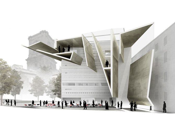 La propuesta geométrica evita esculpir una forma arquitectónica predominante. La contundencia en la imagen proviene, en cambio, de dar forma al vacío resultante. El acceso principal es un gran umbral en donde sombras y penumbras crean relaciones espaciales tridimensionales. Estructura y geometría están intrínsecamente relacionadas, de manera que el hormigón armado es al mismo tiempo estructura y acabado de fachada. La integración de un material industrial en un contexto histórico se consigue por medio de texturas y patrones en los encofrados. Esta estrategia es una forma nueva y fresca de usar hormigón vertido, así como una forma de darle al edificio una presencia más cálida en el centro histórico de la ciudad.