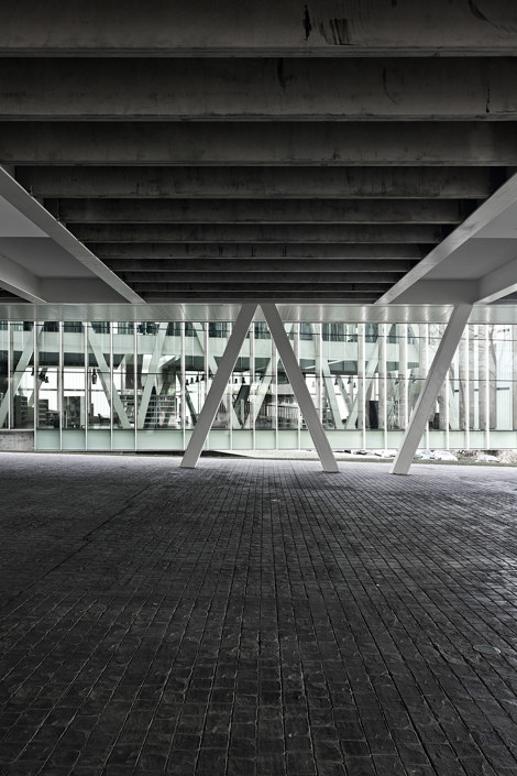Sin embargo, esta cáscara verde y moldeada se ofrece, en su interior, transparente y abierta, abrazando un espacio cívico, un patio cubierto ligado a la ciudad y al paisaje verde reconstruido. La ordenación formal de este centro es reflejo de dos impulsos: uno espacial, que busca el equilibrio entre la nueva arquitectura y el paisaje en el que se integra; otro, dar cabida al programa de necesidades de acuerdo con sus necesidades de relación entre las partes y de uso de cada área (oficinas, espacios públicos, reunión, flexibilidad, etc.).