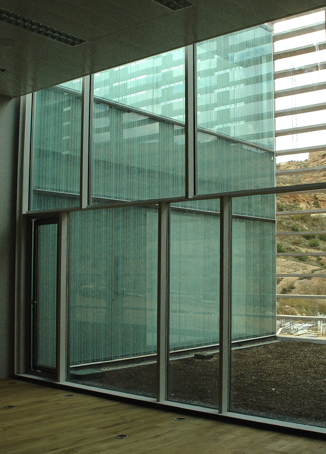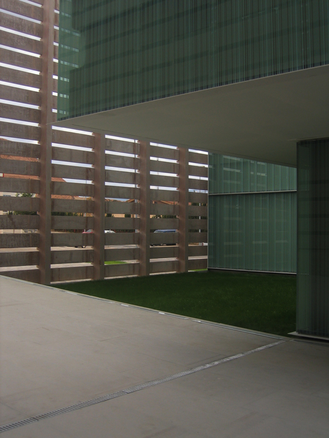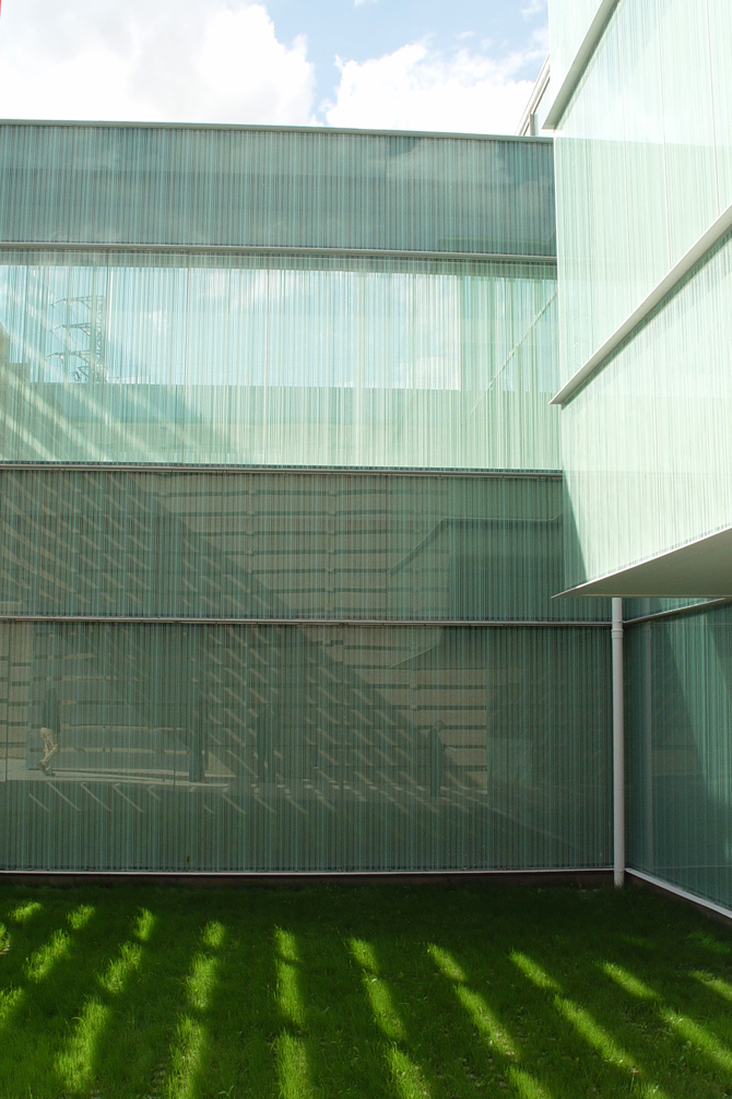 El sistema de cerramiento perimetral, tejido como una cesta para regular su permeabilidad, permite graduar y matizar la relación del centro con su entorno en cada punto: abierto al espacio verde (noroeste), parcialmente cerrado a las vías rodadas y cerrado en la medianería, asegurando la adaptación y continuidad con el entorno existente sin renunciar a las necesidades acústicas y ambientales de los espacios de trabajo. La alternancia de vacíos ajardinados y espacios de trabajo de acuerdo con las necesidades dimensionales y ambientales del programa asegura una transición gradual entre exterior e interior, entre el polígono y el centro, entre lo público y lo privado, permitiendo construir un recinto acotado, abierto y transparente. Un recinto cuya densidad media proporciona al centro valores ambientales muy atractivos, pero también posibilidades de ampliación real y asequible.