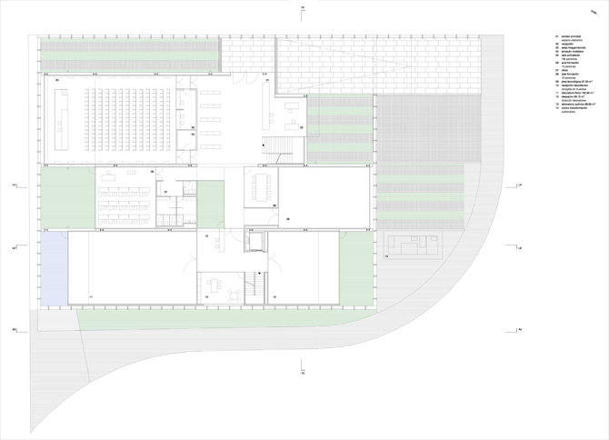 Las diferentes áreas del programa (acceso, servicios generales, formación e innovación, laboratorios) se alojan en las sucesivas crujías que, con anchura variable y adaptable a las necesidades definitivas de la Propiedad, quedan definidas por los propios elementos constructivos y estructurales descritos, reforzando la configuración espacial y planimétrica. La organización funcional propuesta conduce al visitante desde las zonas más públicas–acceso y vestíbulo principal– hasta las más privadas y técnicas –laboratorios y despachos– a lo largo de un recorrido transversal abierto y transparente, enlazando en un desplazamiento quebrado las bandas longitudinales que constituyen la arquitectura del centro.
