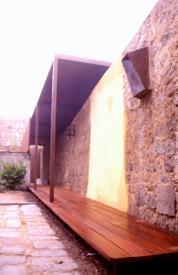 El proyecto mantiene la mayor parte del muro existente. Nuestra actuación se limita a liberarlo de añadidos, reconstruir los lienzos en mal estado y limitar su altura a la de su arranque en la esquina. También se elimina parte del muro que acomete a la muralla. Sobre esta base se apoya una estructura de perfiles tubulares de acero que, arrancando del muro, forman pórticos de un solo vano y que apoyan en su otro extremo en el suelo del jardín.