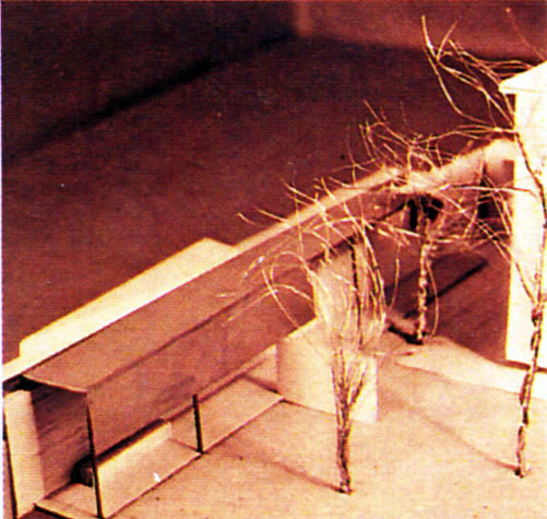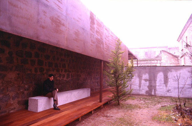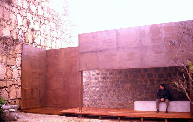 En el encuentro con la muralla, este acero baja hasta el suelo para formar un triedro a modo de remate, evitando así el contacto directo con la muralla del cerramiento. A lo largo del recorrido de esta estructura, las chapas de acero varían la extensión de la cubrición, creando una variada seriación de espacios.