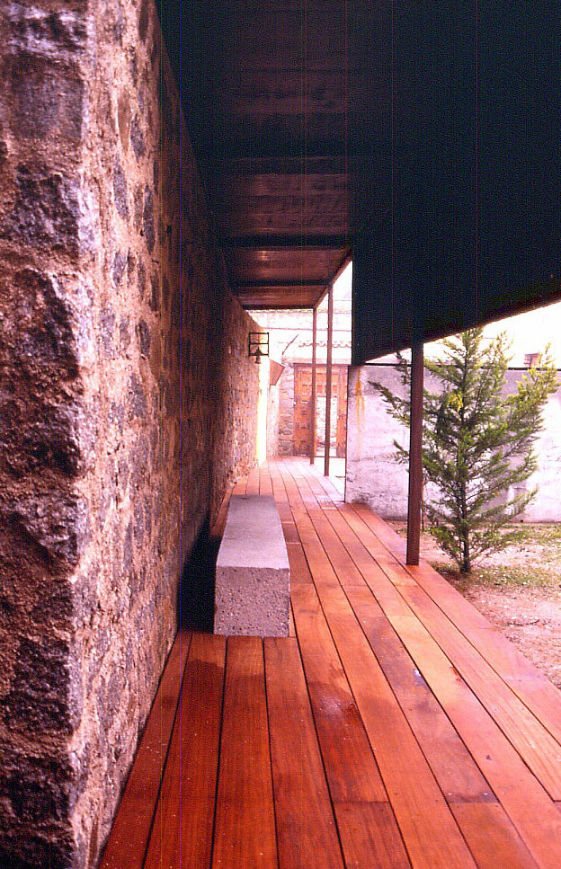 El pavimento bajo esta cubierta se sitúa en un plano elevado sobre el manto de césped. Está conformado con tablones de madera de iroko colocados paralelos al muro.