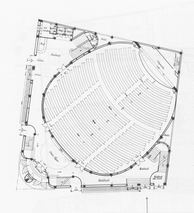 Ubicado en una esquina, Gutiérrez Soto dispuso el acceso en el chaflán curvo y un eje de simetría virtual en la diagonal, con una distribución racional que se convirtió en canónica tras su publicación en el Neufert: vestíbulo en “L” abrazando la sala ovoidal con el escenario y pantalla en el extremo contrario; en los extremos y entrada se introdujeron las escaleras al anfiteatro, con sus palcos y cabina. En planta sótano, con el ingreso por la calle Barceló, se incluyó una sala de fiestas con bar en dos niveles, más una gran pista de baile de doble altura en idéntica disposición que la sala de cine superior. Para rematar la oferta recreativa, en la azotea se incluyó un cine al aire libre de similar ordenación con anfiteatro a dos niveles.