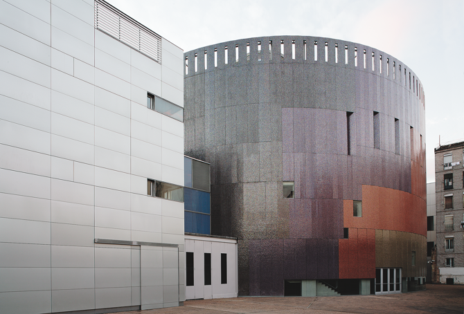 De esa manera el gran tambor del circo se convierte en un receptor y emisor cambiante y facetado de la luz que recibe y todo su color invita a girar en torno suyo y a descubrirlo con aspectos diferentes en cada momento de la luz artificial o natural. En el resto de las fachadas de los diversos edificios interiores adscritos al circo se ha ensayado una fachada transventilada de omegas verticales y horizontales sobres los que se “cuelgan” chapones de aluminio extrusionado en su color.