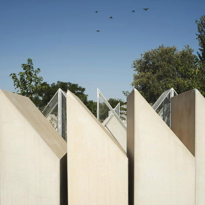 La modularidad se materializa mediante el uso de elementos de hormigón armado prefabricado a partir de un único molde adaptable, facilitando una expansión económica y sostenible. La organización espacial, basada en módulos alineados, configura un entramado de pequeños hogares conectados mediante patios compartidos y áreas de juego, conformando una auténtica "ciudad" diseñada específicamente para perros. La combinación de espacios individuales de descanso con patios exteriores comunes asegura tanto la privacidad necesaria como la oportunidad constante de socialización.
