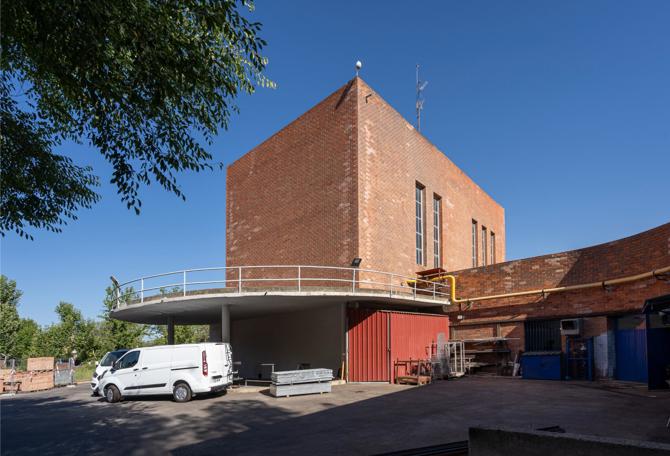 El aspecto general del edificio es de una gran sobriedad: sus rotundos volúmenes y el sencillo tratamiento de los muros de ladrillo visto, únicamente decorados con ventanas en banda que acentúan la horizontalidad de las fachadas, le imprimen el carácter funcional propio de un edificio de servicios sin despojarle de una especial poética.
