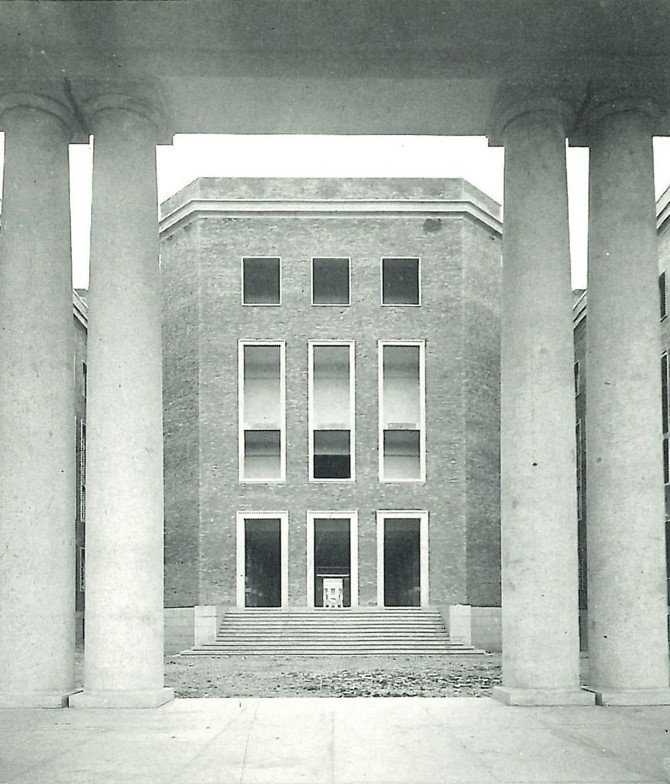 En la planta se fijó un eje principal de simetría, consiguiéndose así en los alzados un aspecto de serenidad y monumentalidad. Los laboratorios ocupan una sola altura, y dos las grandes cátedras, para 500 alumnos cada una, y la sala de conferencias, para 300 espectadores. El edificio tiene su acceso principal por un pórtico de severas líneas en la fachada al campus, y además otros accesos que comunican la facultad, a través de otro pórtico, con el jardín botánico. Este jardín, mejor denominado Escuelas Botánicas, será común para la Facultad de Ciencias, y en la actualidad está ejecutado el movimiento de tierras necesario para establecer las diferentes plataformas y construida la red general de alcantarillado y agua».