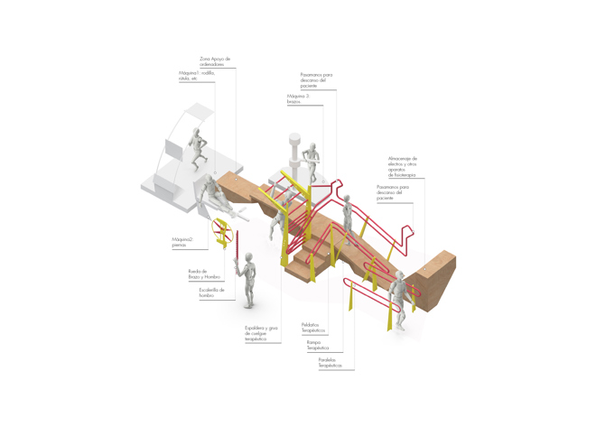 Resuelve diferentes formas de “El cuidado” para las diversas necesidades de los pacientes y también para las particularidades de médicos y sanitarios. Uno de los factores de diseño saludable está apoyado por el proyecto cromático, que crea lo terapéutico con el diseño termodinámico, estableciendo diversos ámbitos de confort climático según la zona de tratamiento, azuladas en la de traumatologías y rosáceo-anaranjadas en las de fisioterapia. La intensidad, dirección y saturación lumínica que perciben los usuarios según el ambiente en el que se encuentren, producen una generación hormonal del usuario.