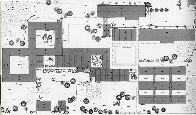 Ha sido criterio ordenador el que el edificio no constituya una unidad monolítica, sino que, por el contrario, se desarrolle en horizontal, no superando en ningún momento las tres plantas de altura. El niño se verá así obligado a pasar de un pabellón a otro para realizar las distintas funciones de su vida escolar, cambiando de ambiente y en contacto constante con el espacio exterior, estimulando su imaginación y reduciendo al máximo el sentimiento de encierro que los antiguos colegios, unitarios, tristes y solemnes producían.
