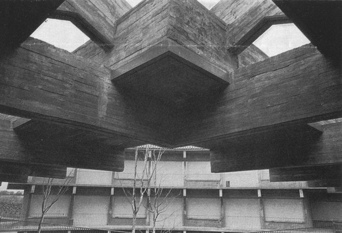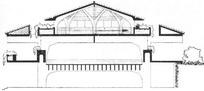 Combinación de un sistema constructivo a base de estructura y cerramientos de hormigón visto tanto al exterior como al interior, con cubierta tradicional a cuatro aguas de teja árabe vieja. Para aumentar la luz que podría disminuir con los grandes aleros, se introducen ranuras corridas en los arranques de los voladizos, para que la luz pueda acceder a los ventanales filtrada a través de la vegetación situada en las jardineras de las cubiertas.